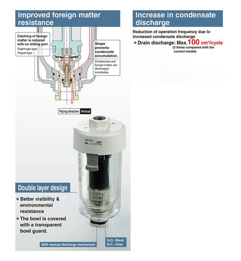 The AD402/600 series auto drain valve automatically discharges drainage. It is highly resistant to dust and corrosion. This series operates in a reliable manner, without requiring human operators. A case guard is provided as standard equipment.